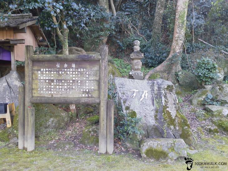 【伝衣塔】渡宋天神伝説にまつわる塔。菅神は、博多の承天寺の鉄牛和尚の枕元に、禅師から賜った僧袈裟を持って現われ、これを一所に収めてほしいと頼まれた。その告の通り太宰府の岩崎の場所に収めて伝衣塔を立て、鉄牛和尚は横に「神護山光明寺」を開山。
