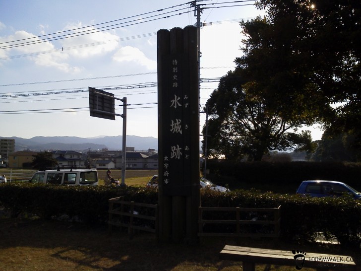 【水城跡】664年、唐と新羅の攻撃に備えて築かれた大宰府の防衛施設「水城」である。その規模は全長1.2kmにわたり、基底部で幅80m、高さ13mを越える人工の堤防を築き、その博多湾側に幅60m、深さ4mの堀をつくり、水を貯えたという。